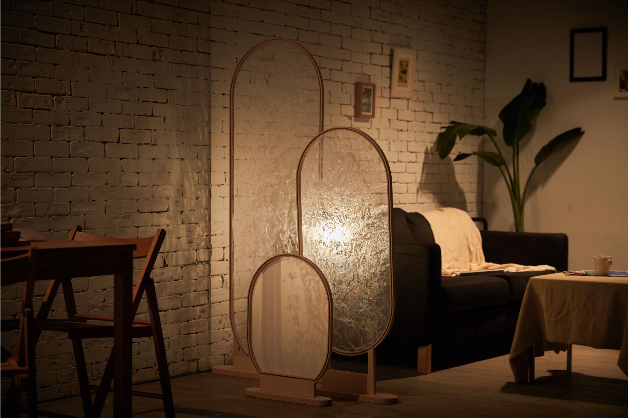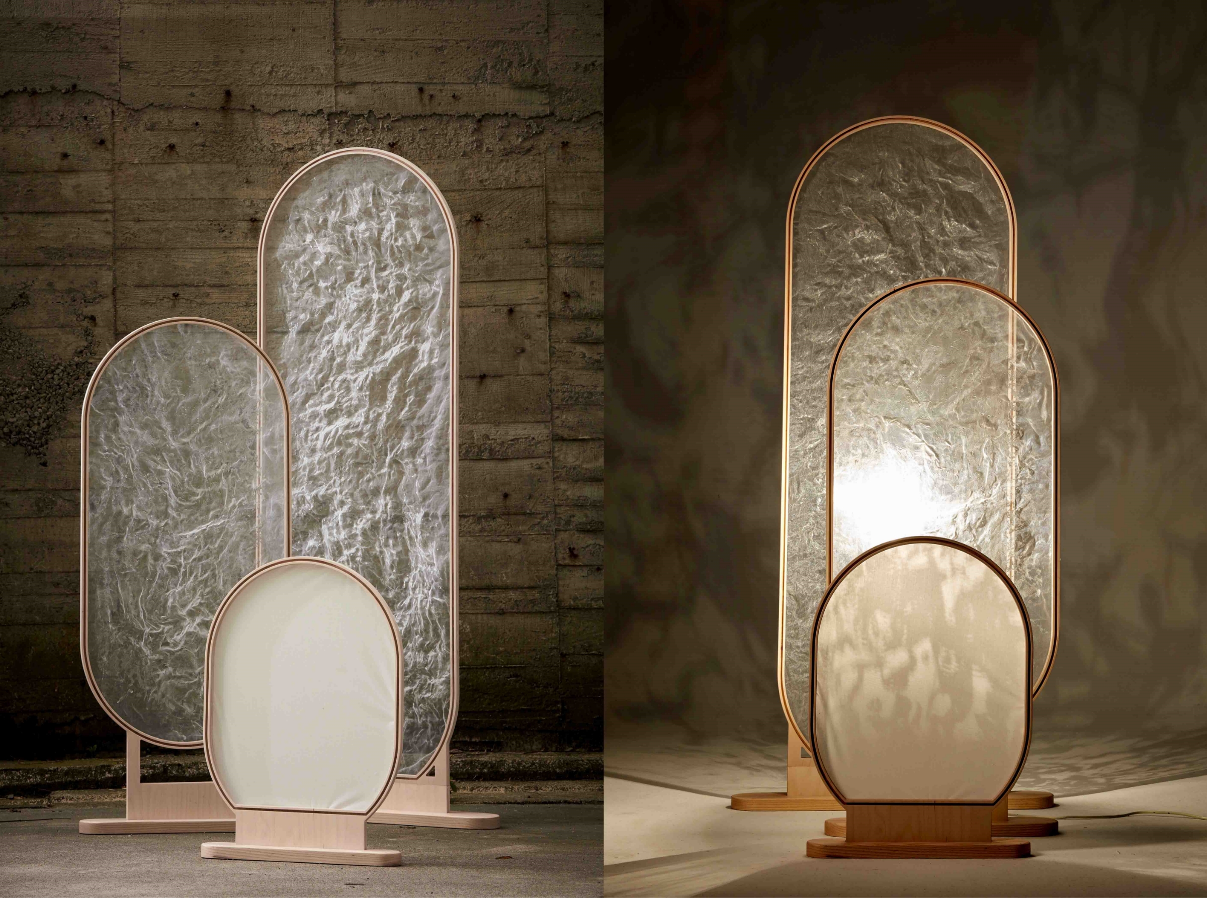 Here we recreate it, reuse the characteristics of its shadow and toughness after being folded, and employ epoxy resin to the retain the original appearance of its material to create frozen-dew-like lights while the shadow demonstrated a sense of huge shades. Then we use the skills of making gauze to increase the possibility to objectify it and make it another new scene.