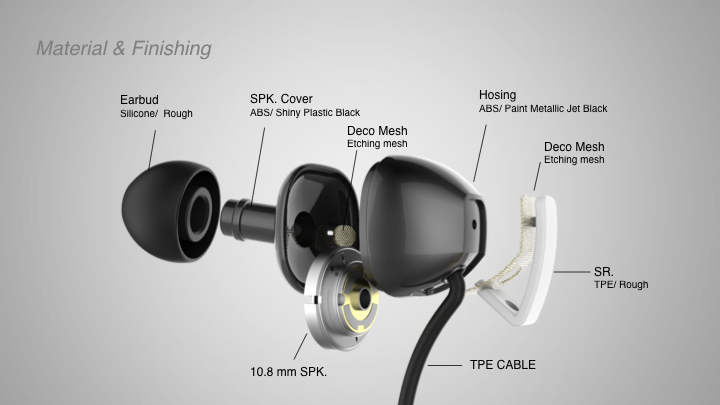 From the first look of the earphones, you can see the golden deco mesh, shines at behind. The white plastic part behind earphones is also preventing the cable from breaking.